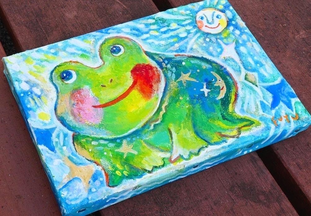 水が嬉しいカエルさんの絵です◎